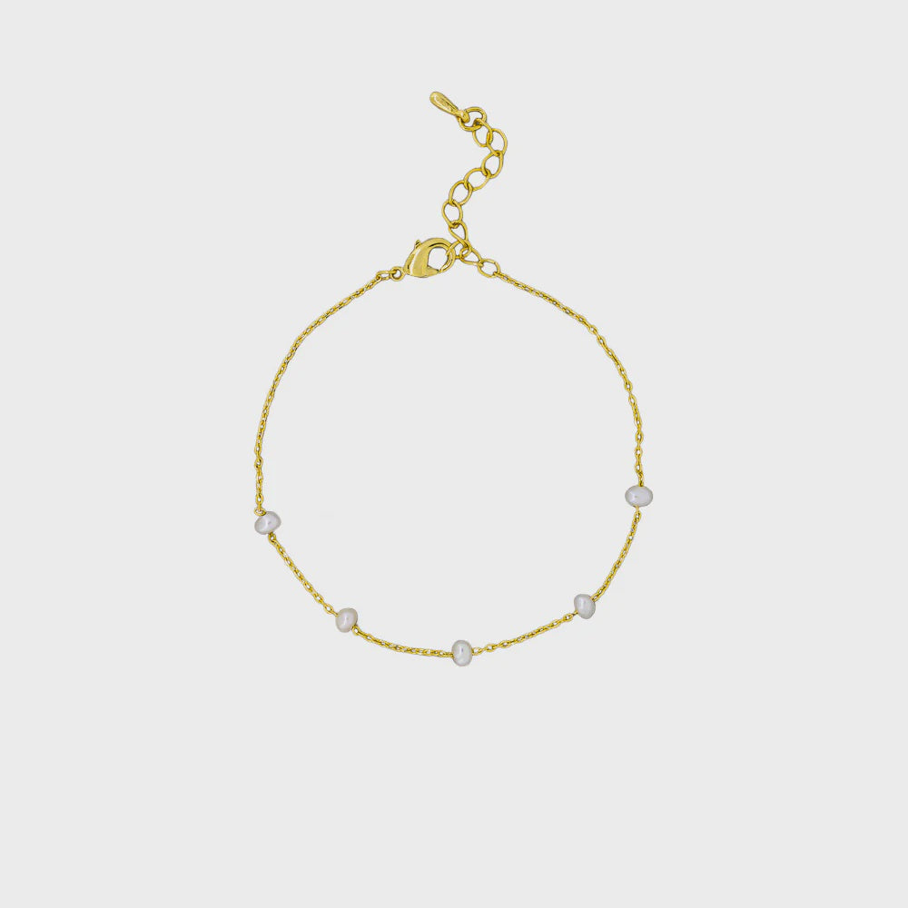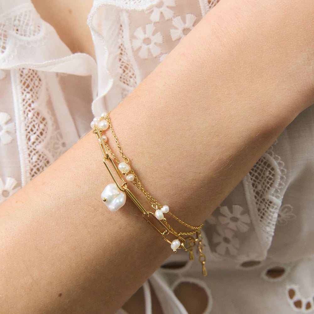 Exude elegance with the Cobi Bracelet. This piece features a beautifully intricate gold linked chain with a string of sleek, small pearls.