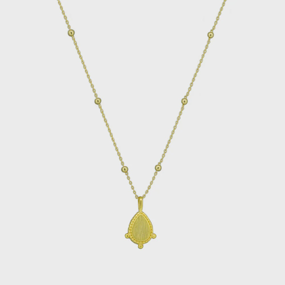 The Leora Necklace has a teardrop pendant and is adorned with small balls along the chain. Show off your style by wearing it alone or layering for a boho look.