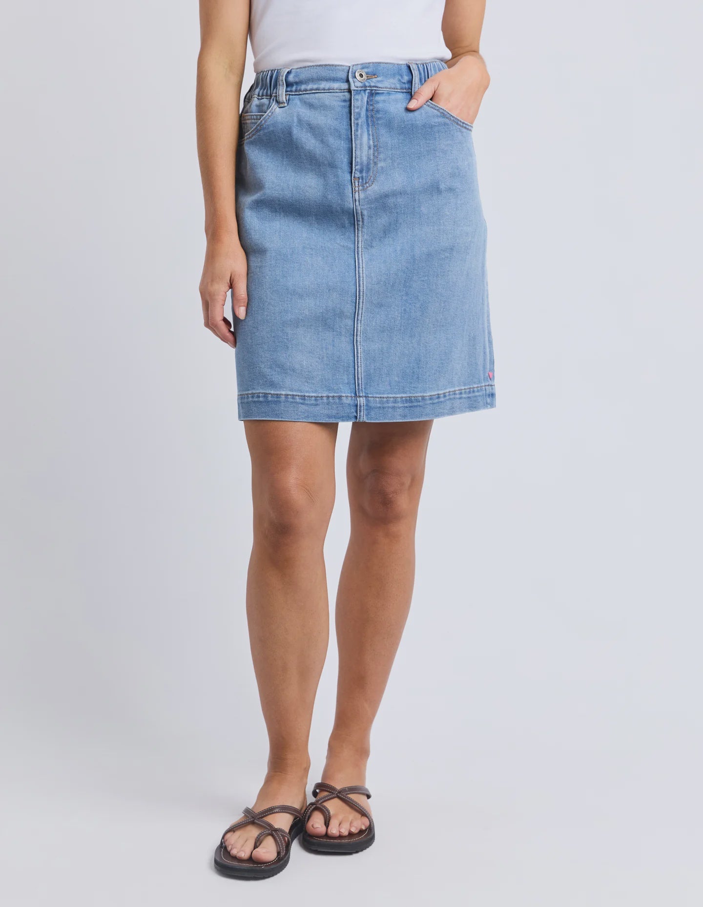The Birdie Denim Skirt brings playful charm with its comfy elastic at the side seams and back waist, giving you the perfect fit every time. Its knee-length cut is easygoing and flattering, while the Elm-stamped hardware adds a fun, unique touch to this effortlessly stylish skirt.