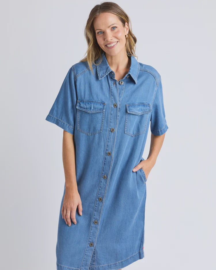 Elm Cora Denim Dress. A classic shirt style lightweight denim dress for the ages. This timeless piece is an easy throw on and go piece that you'll be wearing on repeat. 85% lyocell 15% cotton denim. Model is 171cm and wears Size 10