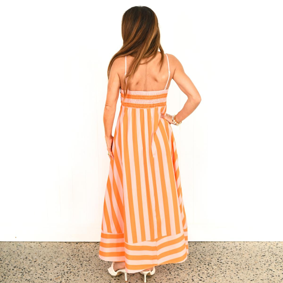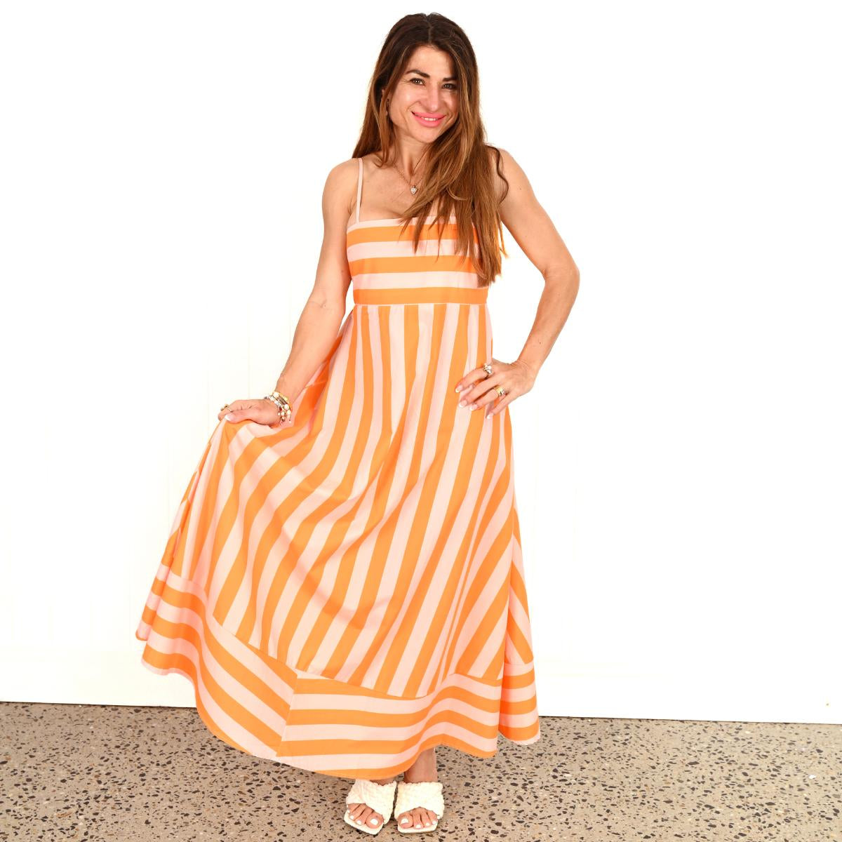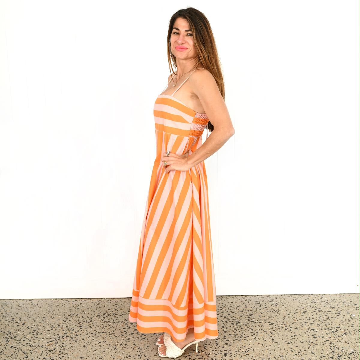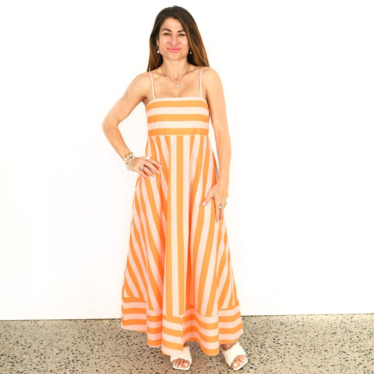 The Lara Dress is a standout maxi in the sunset vibe. Perfect for the summer party, with shoestrings straps in cotton, this dress is one for the warmer days.
